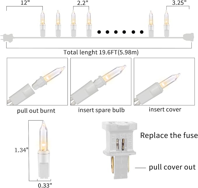 - 【White Wire Christmas String Lights Decoration】:100L traditional incandescent Christmas light set,19.6Feet Clear(Warm White) Christmas Mini String Lights,each set include 4 Extra Bulbs & 2 Replacement Fuses.Perfect for indoor and outdoor decoration.Plug in,put it where you want,watch and enjoy this light.The light can be reused for many years.