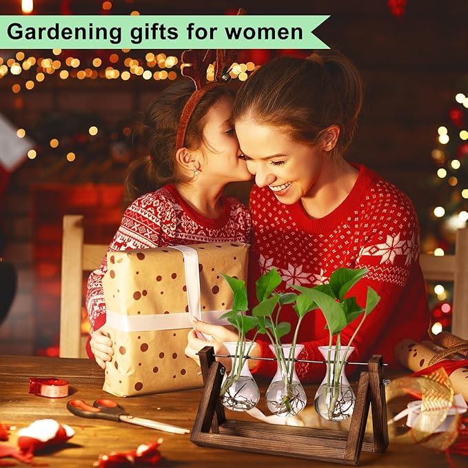 YIBOT Propagation Stations,Plant Terrarium with Retro Wooden Stand, Unique Gardening Birthday Gifts for Women Plant Lovers, Hydroponics Plants Home Office Garden Decor - 3 Bulb Glass Vases