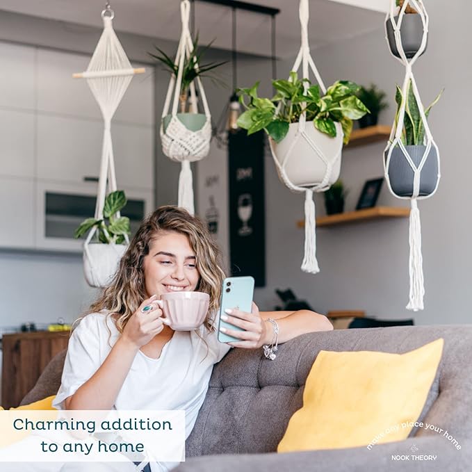 Nook Theory 4-Pack Macrame Plant Hanger - with 8 Ceiling Hooks - Hanging Planter Indoor Outdoor - Hanging Plant Holder - Decorative Bohemian Plant Hangers - Hanging Plants (Pearl)