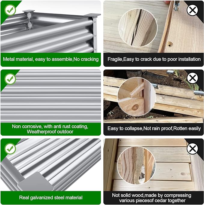 - Unique design: raised garden beds outdoor for vegetables, it is our custom-designed style The upper part of the garden bed is galvanized sheet, the middle bottom plate is a stainless steel shelf, and the lower 4 legs are aluminum alloy legs, which are more durable than wooden and anti-rust performance keeps it in the best condition for a long time. The 4 corners above and below the raised garden bed are protected with pads, which not only effectively prevent sharp corners from poking people, but also prevent the floor from being scratched.. The garden box is exquisite and stylish, it brings great convenience to our planting life.