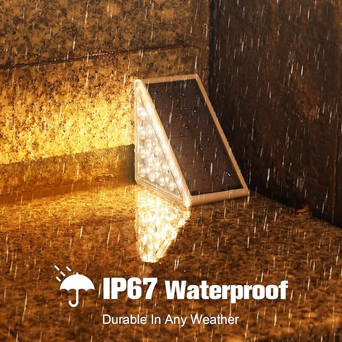 • 【Easy Installation】No wiring required, solar lights for steps are perfectly decored on garden stairs, patio, yard, deck, porch step and sidewalk,etc. The triangle solar outdoor lights go in the corners so they are not in the way. No worry about stepping and tripping. 2 installation ways: 1)Directly attached to the stairs by 3-M sticky tape. 2)Fix the outdoor accessories on the stair by screws and bolts. (Tips: Solar stair lights need to be installed in a sunny spot.)