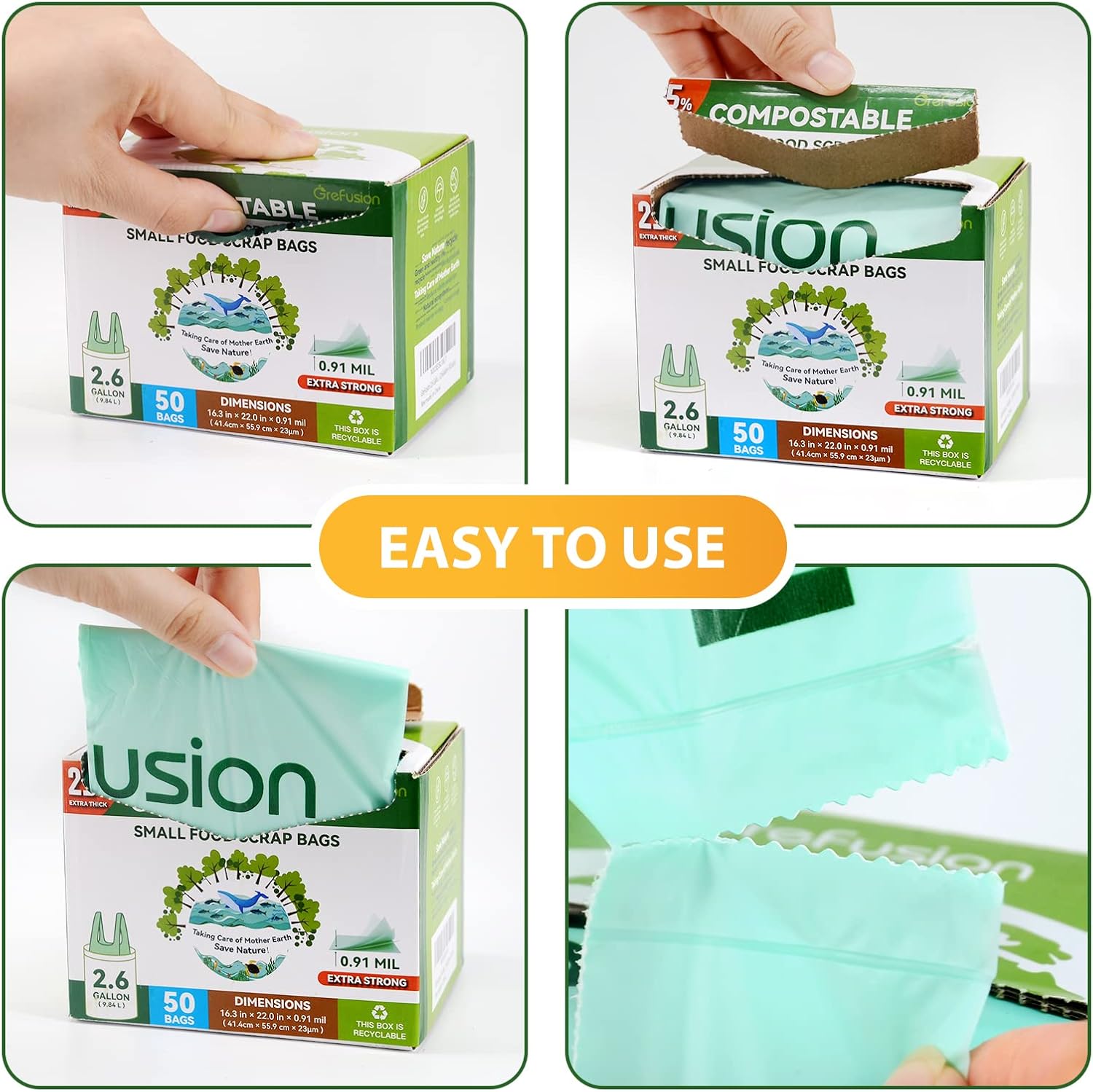 - 【STURDY COMPOST BAGS &UPDATE SUPER THICK 0.91 MIL 】We are Proud of update the design of GreFusion compost bag thick with 0.91 Mils for get carry weights up to 17.5 pounds,As kitchen trash can bags are able to withstand a heavy load of wet food waste and hot coffee grounds without any ripping.and sturdy enough with less chance of perforation by sharp leaves. keep a grefusion compost bin bags come in the home and go with confidence to stop the mess .