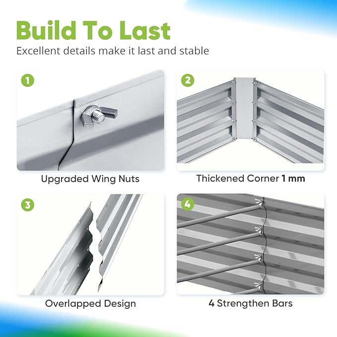 - 【Built To Last】Raised garden box is made of powdered coating galvanized steel panel, assure fine condition of the metal garden bed, it's able to stand harsh weather conditions, won't crack in years. Contact us for any question, 5 year service for raised garden bed parts, you can use without any concern.