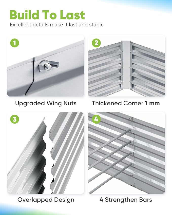 - 【Built To Last】Raised garden box is made of powdered coating galvanized steel panel, assure fine condition of the metal garden bed, it's able to stand harsh weather conditions, won't crack in years, use without worry.