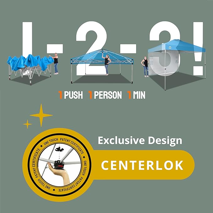 - ONE BUTTON EASY SET UP - Our 10x10 pop up canopy tent features patented one push center lock tech. With just a single push, the central hub locks the poles in place. Designed for the next generation, this outdoor canopy for patio can be set up by two people in seconds without any tools. Three adjustable height settings with soft, pinch-free buttons ensure convenience and safety, making it perfect for camping, beach outings, craft fairs, tailgating, farmer markets, outdoor BBQs, and more