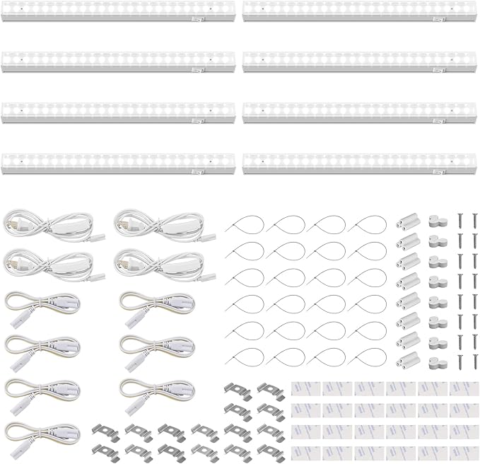 - What You Get: 8 x Barrina T5 Grow Lights, 4 x Power Cords with ON/OFF Switch, 7 x Connecting Cords(20''), 8 x Small Connectors, 16 x Installation Clips, 24 x Double-sided Tapes, 24 x Cable Ties