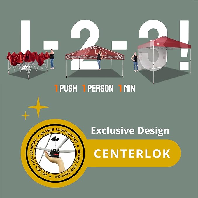 - ONE BUTTON EASY SET UP - Our 10x10 pop up canopy tent features patented one push center lock tech. With just a single push, the central hub locks the poles in place. Designed for the next generation, this outdoor canopy for patio can be set up by two people in seconds without any tools. Three adjustable height settings with soft, pinch-free buttons ensure convenience and safety, making it perfect for camping, beach outings, craft fairs, tailgating, farmer markets, outdoor BBQs, and more