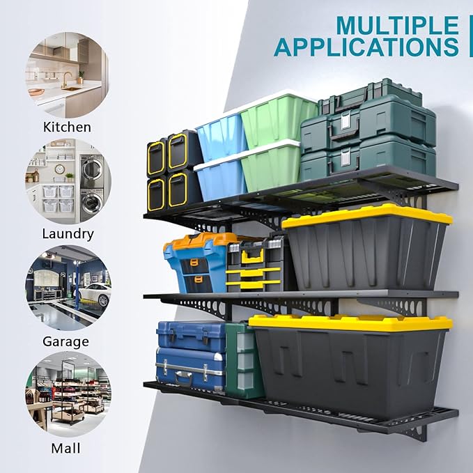 - 🔧 Specifications 🔨: The size of a single shelf is 2 x 3ft (24 x 36 inches) and weighs 11 pounds. The heavy-duty powder coated steel garage storage rack provides high-quality hardware for each component. It depends on the load-bearing capacity of the wall and the installation environment. The maximum load-bearing capacity of each shelf is 250 pounds.