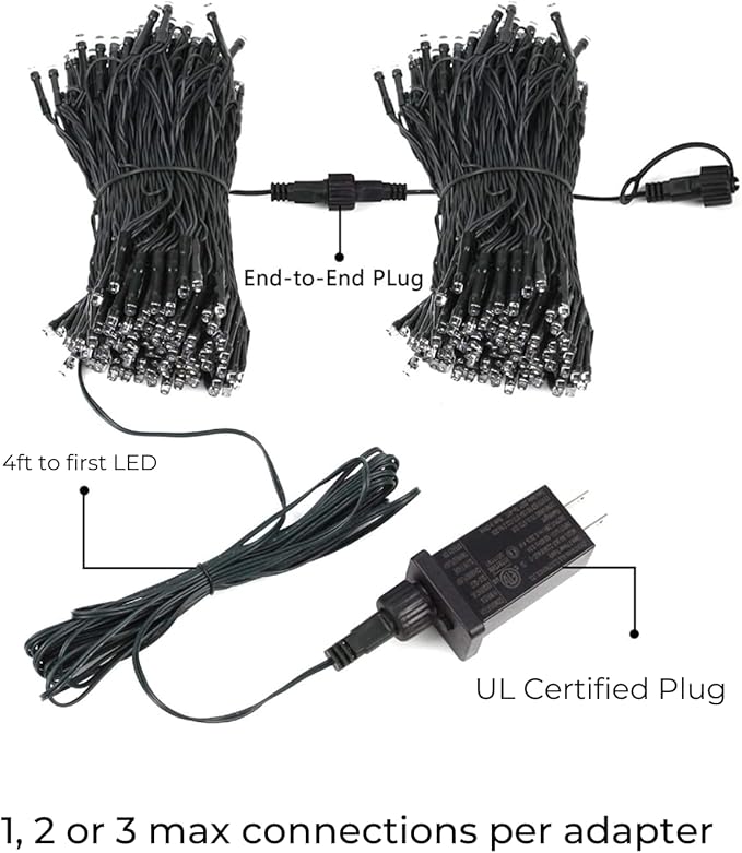 - End-to-End Expandable: Connect max 3 sets, Each connection can have a maximum of 100 Lights per strand, for a total of 300 Lights connected per adapter.