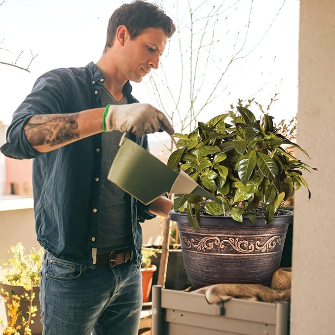 Plastic-Plant-Flower-Planters-14 Inch with Drainage Hole & Saucer, 3 Packs Lightweight Large Resin Flower Pot Indoor Outdoor, Retro Antique Imitation Decorative Garden Containers Sets for Houseplants