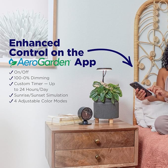 • Easily customize your smart grow light via the AeroGarden app, with features including custom light schedule, dimming capabilities, sunrise/sunset setting, and four adjustable Light Modes