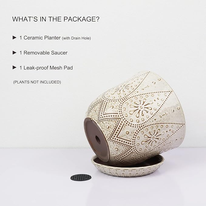 • Size & Package: 8.0 Inch Pot . Package: contains 1 ceramic flower pots, 1pcs mesh pads and 1pcs saucers(NOT INCLUDE PLANTS)