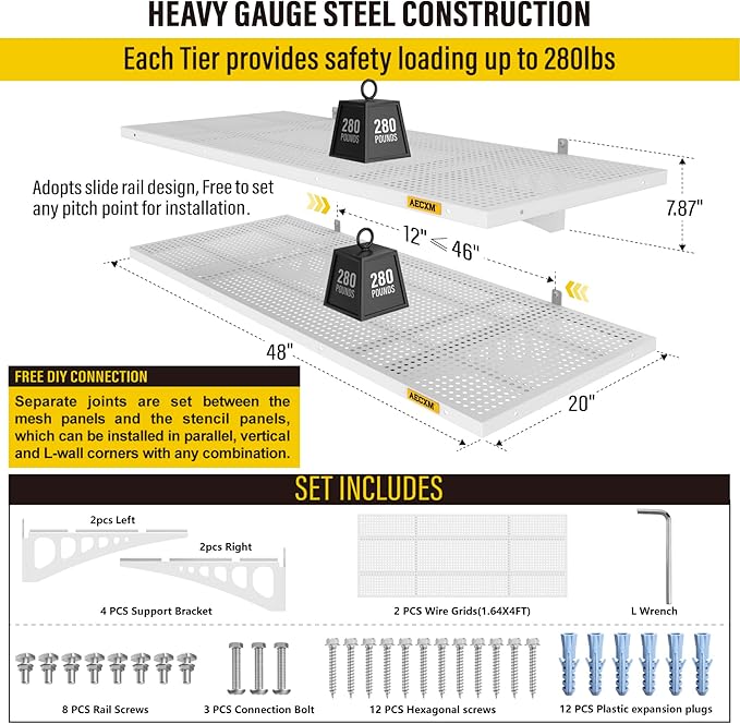 - Premium Craftsmanship: This garage wall shelving is crafted from a single steel sheet, precision-stamped and folded for strength. Unique high-density hole design enhances functionality while delivering a sleek, modern aesthetic