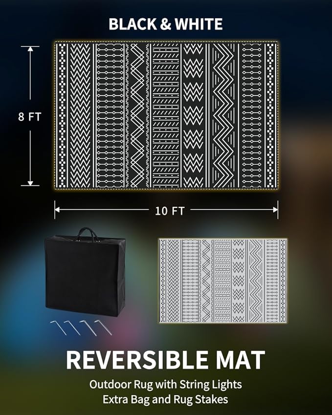 - Lightweight & Portable: Lightweight material and folding lines enables you to fold and pack this large outdoor rug into the carrier bag for other uses, such as camper rug, beach rug, outdoor rv rugs for under awning. Convenient tie-down lanyards and rug stakes ensure you securely stake the rug in place outdoors.