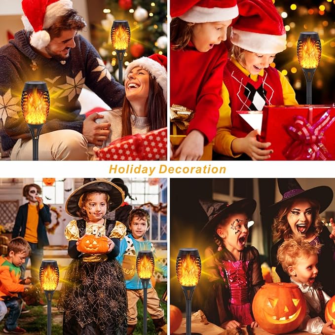 - Upgrade Solar Torches Lights with Flickering Flame: Mini-Size 6LED solar lights outdoor cast a gorgeous, soft, vivid and safe glow, which provide a charming campfire atmosphere for your family. Solar torches are suitable outdoor decorations for patio, garden, yard, porch, making your garden stand out in the community