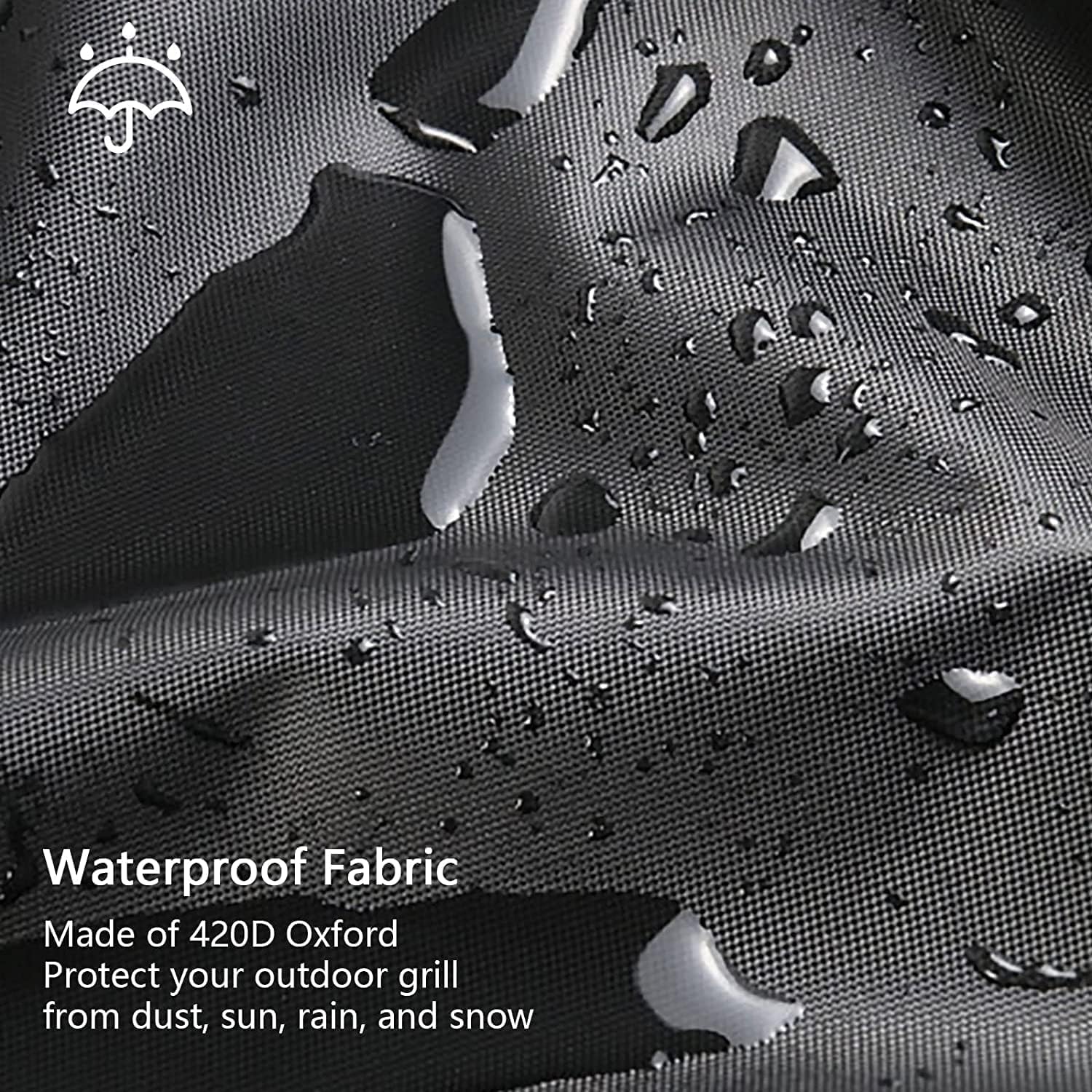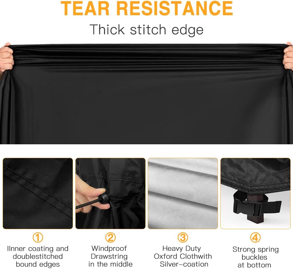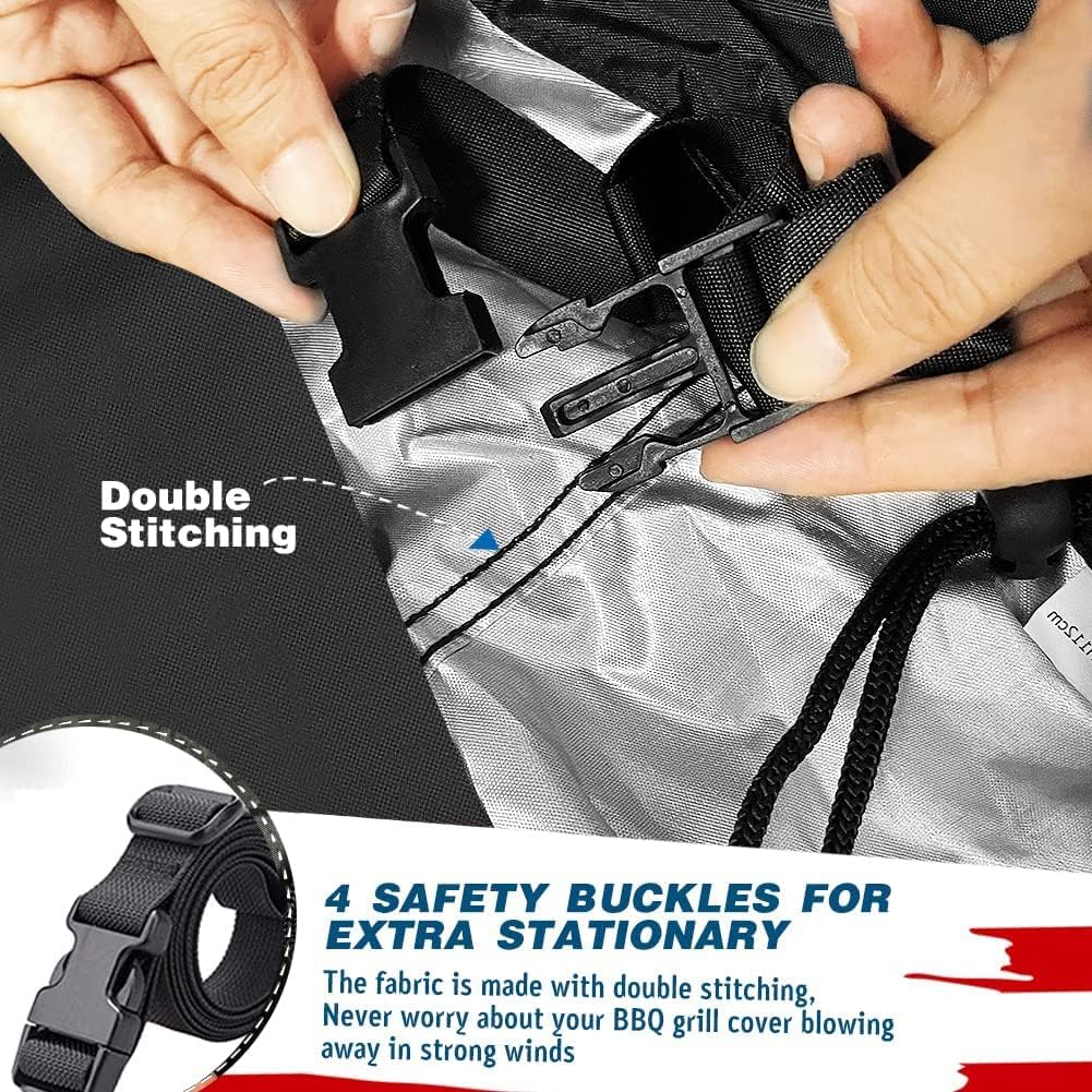 - Snug Fit & Upgraded Windproof BBQ Grill Cover - The bbq grill cover is equipped with padded handles and drawstring straps,360Β°Drawcord Locking System, the drawstring cords both at the bottom and in the middle can be adjusted for a proper fit.The four buckles at the bottom can quickly tighten,making the grill cover tightly wrapped on your outdoor grill, not being blown away by the wind.