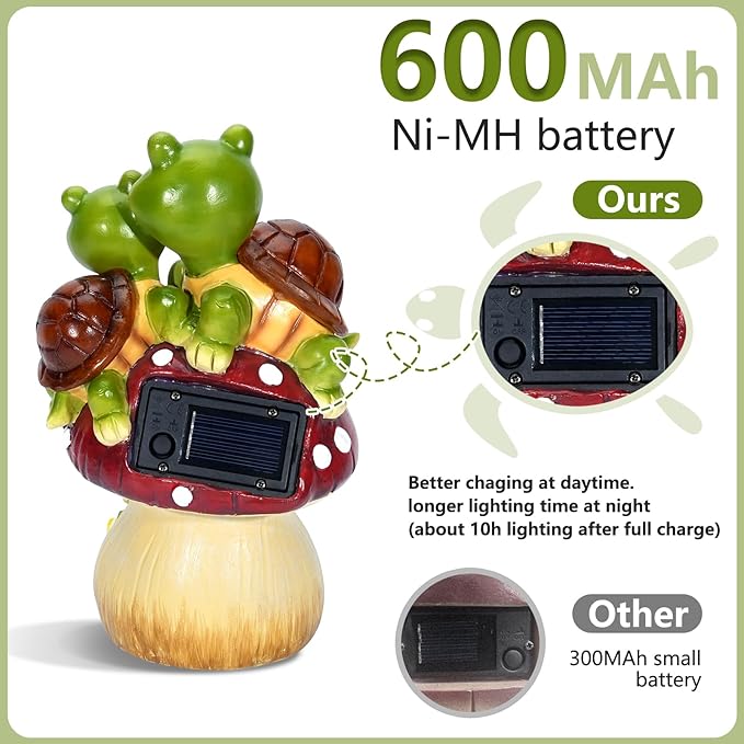 • Attractive Large Mushroom with Lovely Turtles: This 9-inch tall solar mushroom garden statue catches all the attention, no matter where you place it. Warming up your garden and your life.