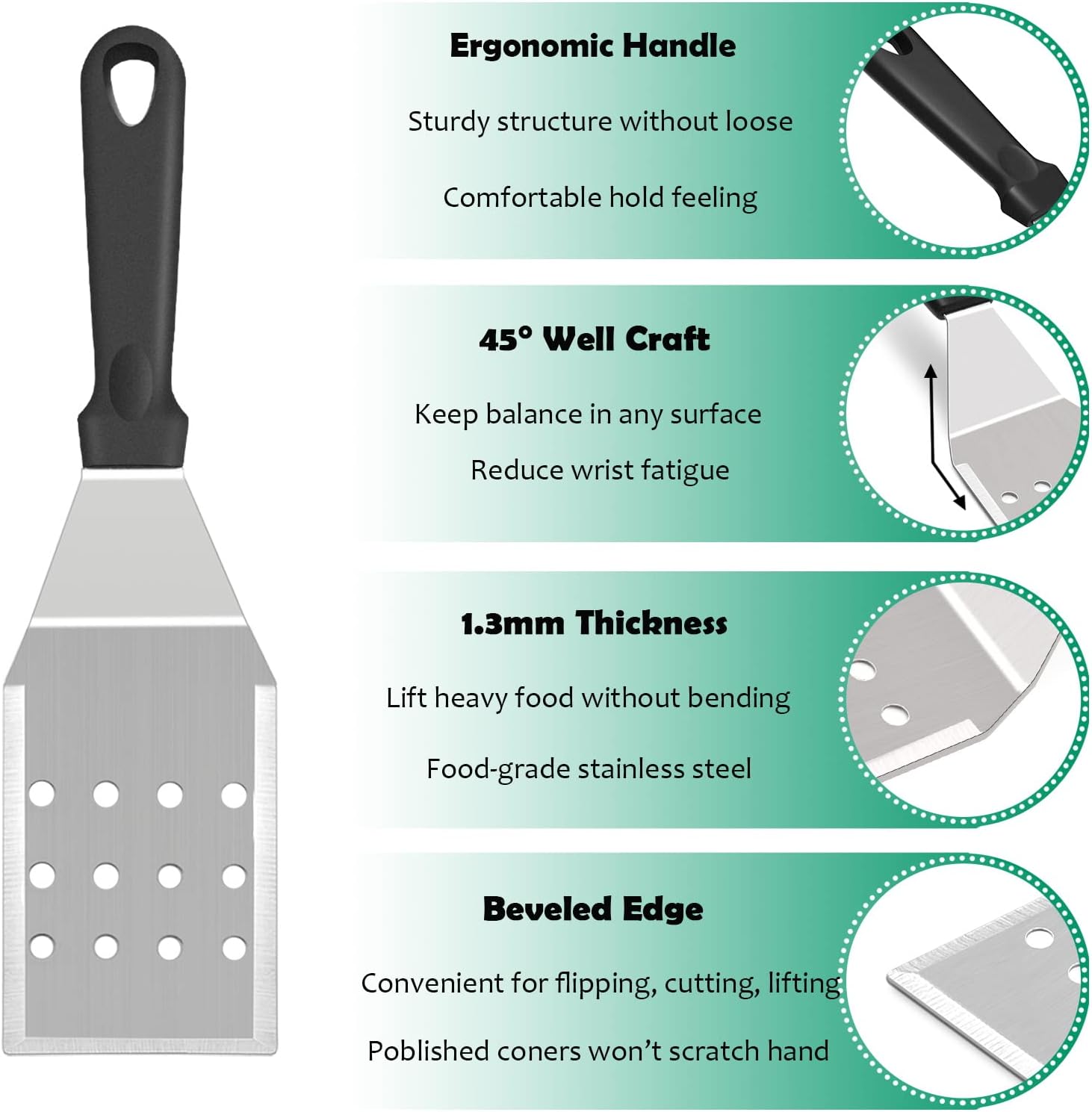 - Thoughtful details: 5inch long handle is suitable for most of a personβs size need, Frosted surface is easy to grip and comfortable to hold, Oval grooved for thumb can reduce wrist fatigue effectively, 45Β° angled structure between the handle and blade is perfect for grip and prevent handle gets hot from high temperature, Beveled edge with polished corners is convenient for easy lifting, turning, flipping, but wonβt scratch your hand