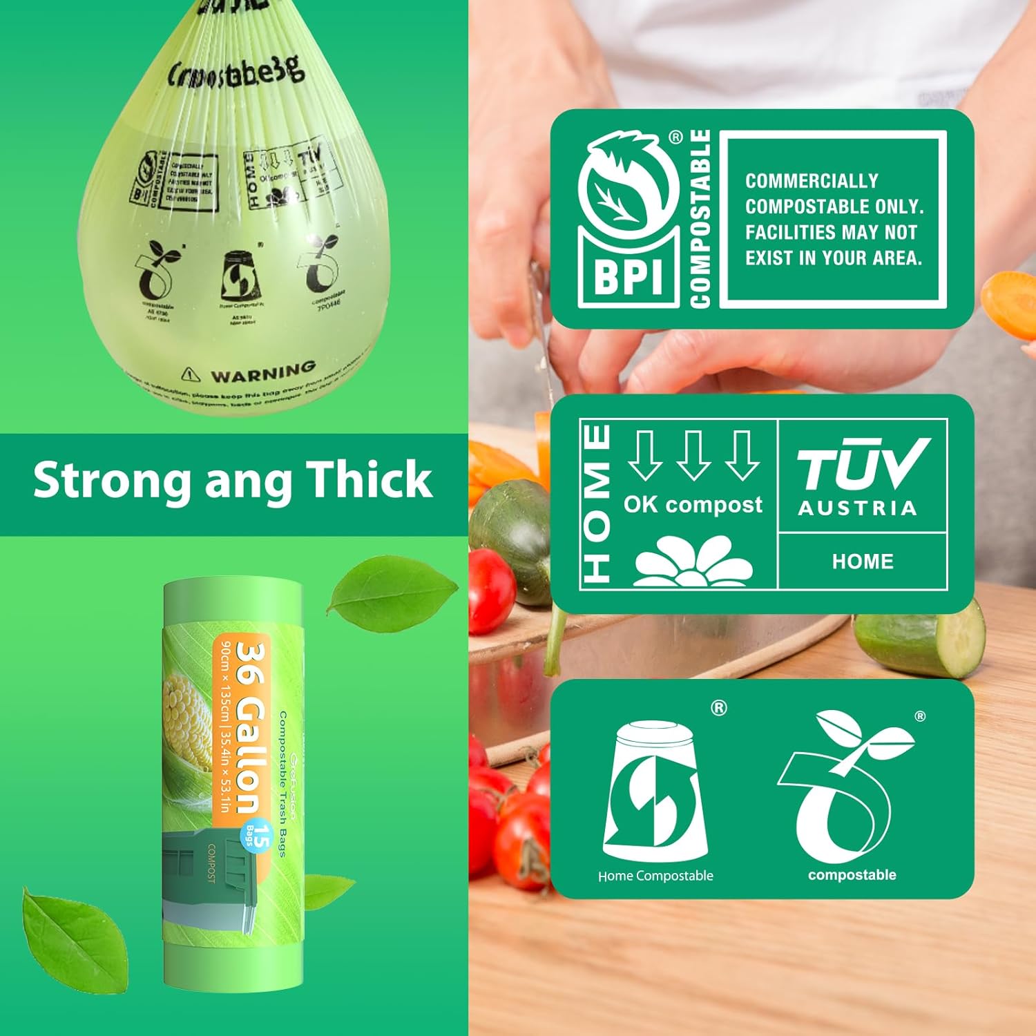- πγFOR FOOD WASTE&YARD WASTE&ORGANIC WASTE RECOVERYγThe compostable trash bag size of 33-36 gallon are great for compost bin kitchen to collect food scraps,also can be used as kitchen trash bags, yard waste bags .The large compost bags are perfectly fit most large compost can design with star-sealed at the bottom. Kitchen compost bags are extra thick 1.28 Mils, durability leave no space to leak and not easy to tear.