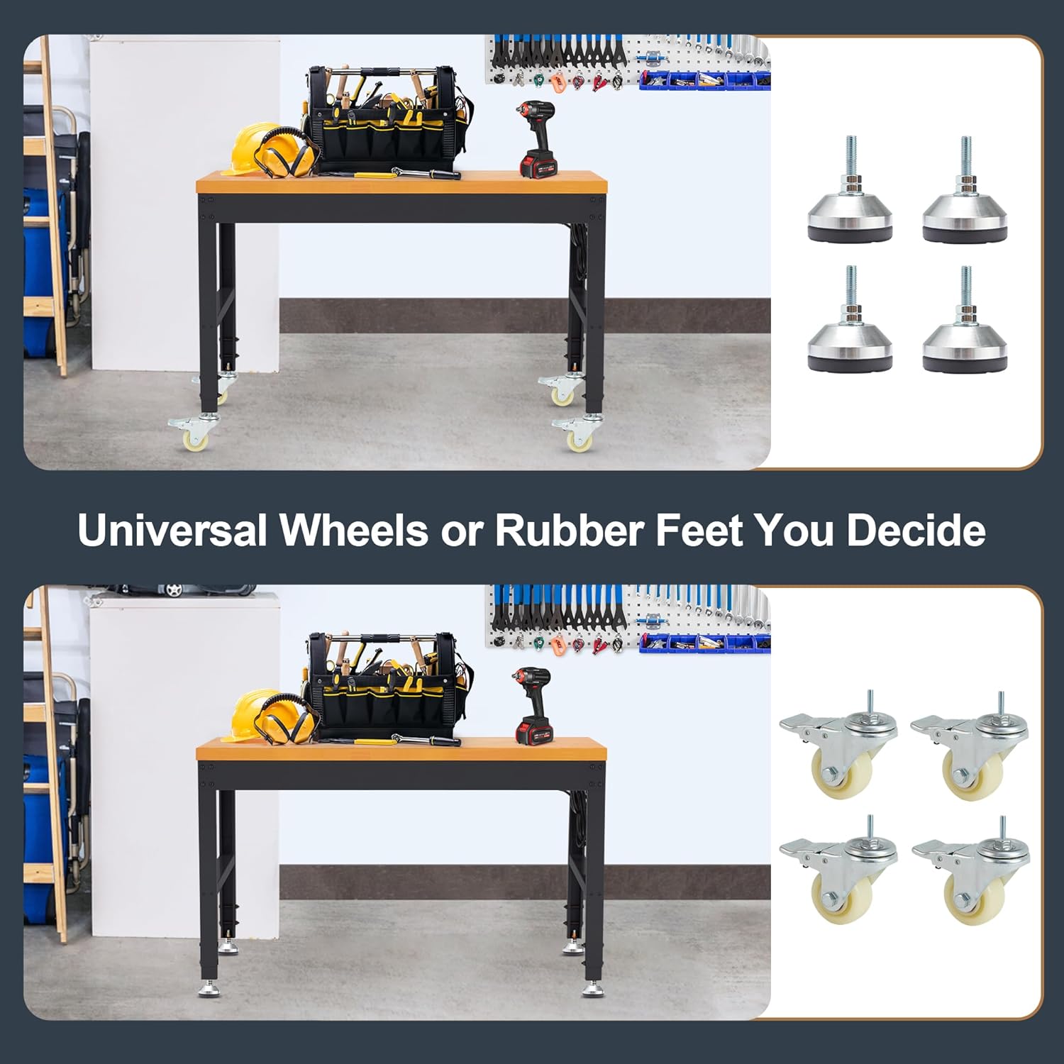 - Upgrade Metal Wheels: Equipped with 4 locking wheels, the workbench is effortless to roll around, whether indoor or outdoor; For wheels-less, just simply switch to 4 non-slip feet