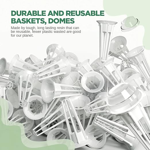 - 【Durable and Reusable Baskets, Domes】 The basket and grow dome are made of high-quality resin that's tough and long lasting, making them easy to reuse. Package going with 60 sponges and 25 planting baskets because those baskets are made of tough, long-lasting resin that can be used over and over. Plus, using fewer plastic like that is much better for our planet.