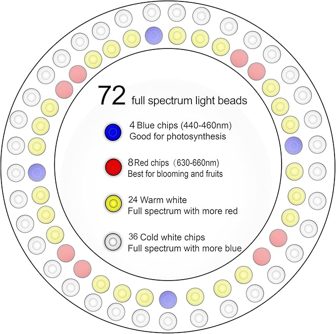 - 72 LED Grow Light Full Spectrum - Compact grow light with high quality super bright LEDs, offer full spectrum 380nm-800nm, including white5000K/36 LEDS,warm white 3000K/28 LEDS,red/6 LEDS,blue2 LEDS to effectively promote indoor plant growth any time of year, beneficial to entire growth period.