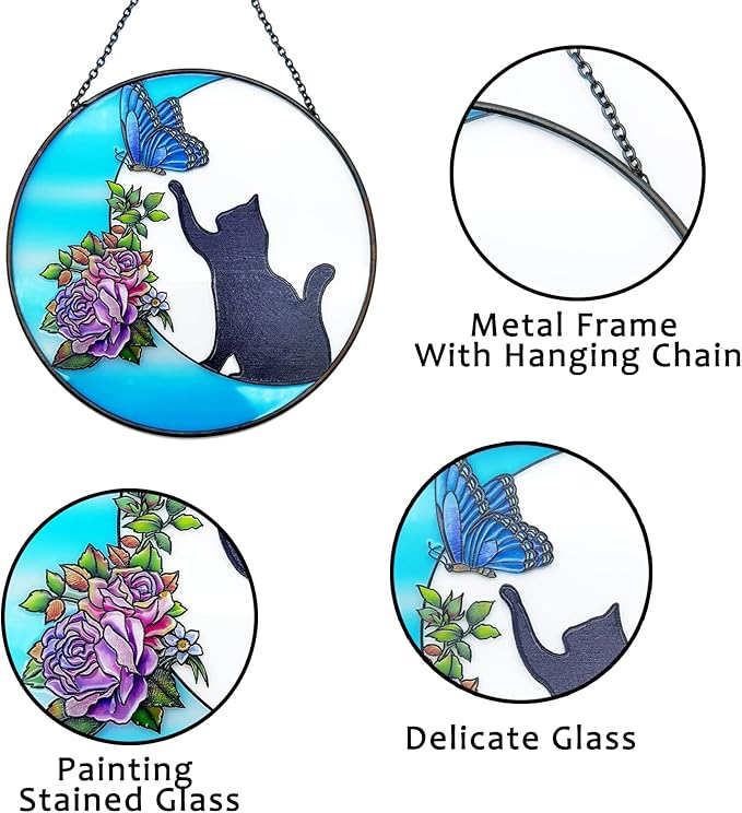 - CAT STAINED GLASS HANDMADE ARTICLE GIFT: The moon cat visor is made of a beautiful piece of colored glass. The special handcrafted drawing of a cute cat catching a butterfly, combined with the moon flower, presents you with a pleasant mood.
