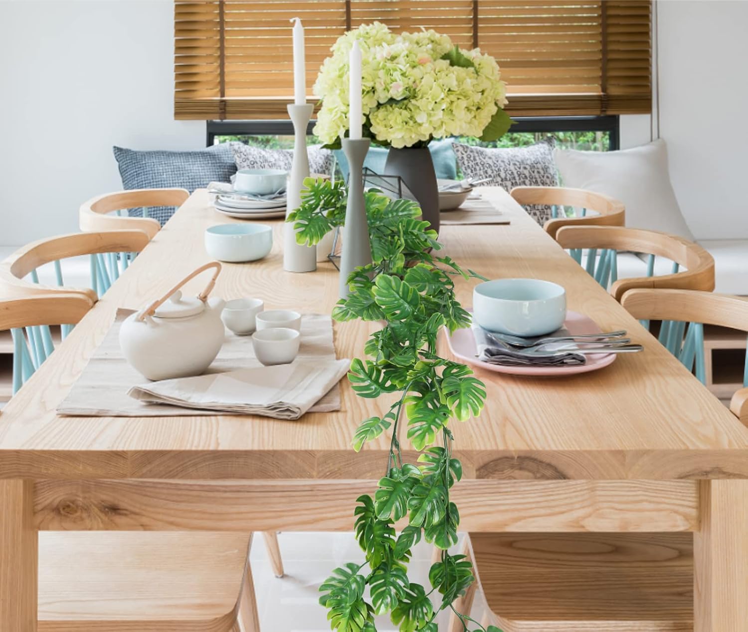 - Hanging Monstera Plant Garlands: The faux ivy vine monstera leaf has a clear texture, with high degree of simulation, strong stems with iron wire inside, and can be bent into any shape. Add landscapes to your patio or balcony indefinitely throughout the year. Create a green and natural visual enjoyment