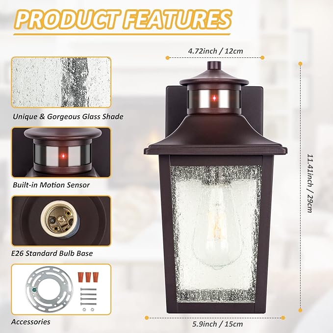 - 【Stylish, Classic & Versatile】Boasting a timeless, classic design complemented by a textured matte oil rubbed bronze finish and distinctive glass, our motion sensor outdoor wall lights make an eye-catching addition to any outdoor area. Ideal for doorways, garages, porches, and yards, these motion sensor outdoor porch lights have both style and function.
