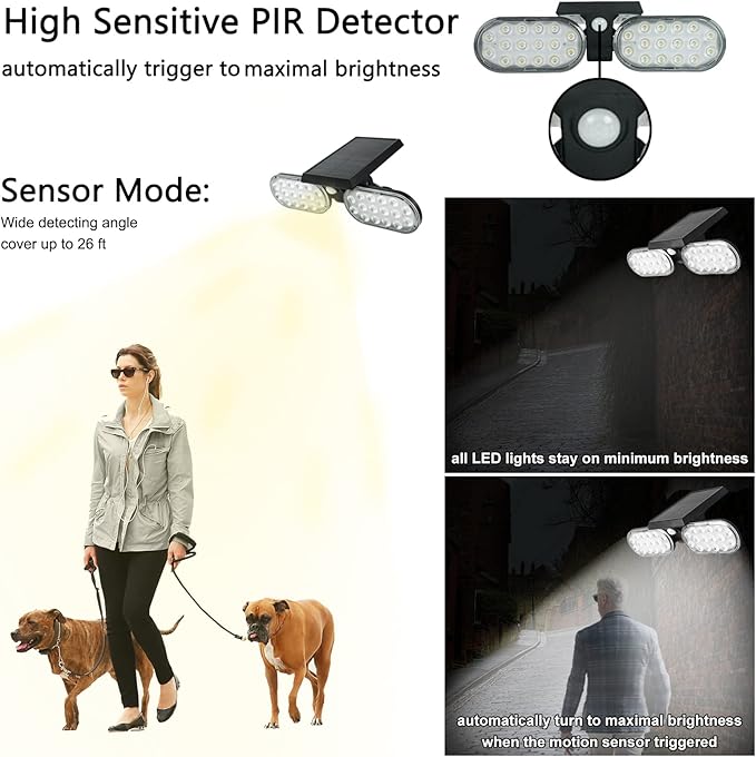 - 2 Lighting Modes – Solar motion lights have 2 modes, Sensor Mode: all LED lights stay on minimum brightness and automatically turn to maximal brightness when the motion sensor triggered, Safety Mode: all LED lights keep lighting on medium level of brightness