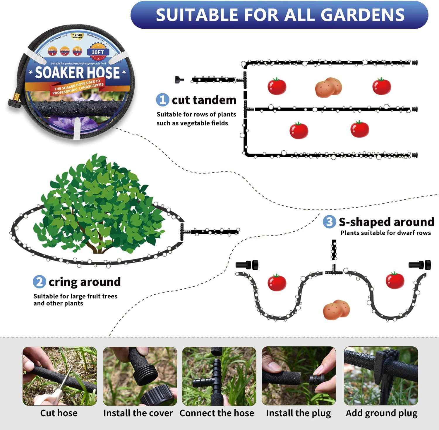 - Save Water and Protect Your Garden - As soaker hoses don’t spray, they enable the user to reduce water usage. There’s no waste involved, as the water goes straight from the drip hose into your garden. Further, the slow oozing of the drip hose prevents runoff and erosion in the garden. Traditional irrigation system will make your garden muddy and mess. And overwatering will make vegetable plant’s leaves are going to turn yellow or fall off.