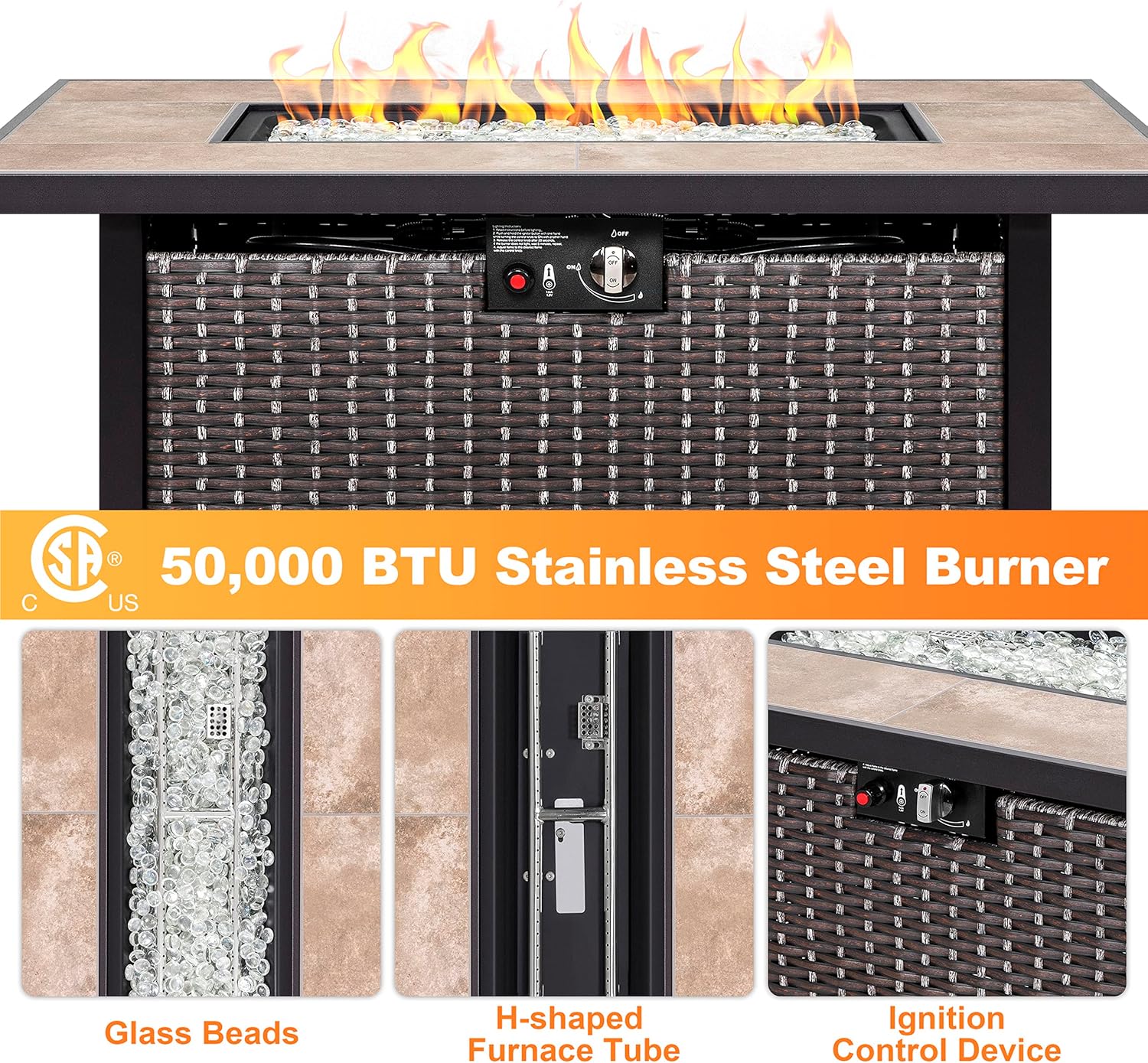 - SAFE & CSA CERTIFICATION: CSA-approved outdoor gas fire pit table has standard 20-pound propane tank at 50,000 BTU. Dual-tube stainless steel burner allows you to light the table safely, just push the button and turn the control knob to adjust the flame to the desired temperature