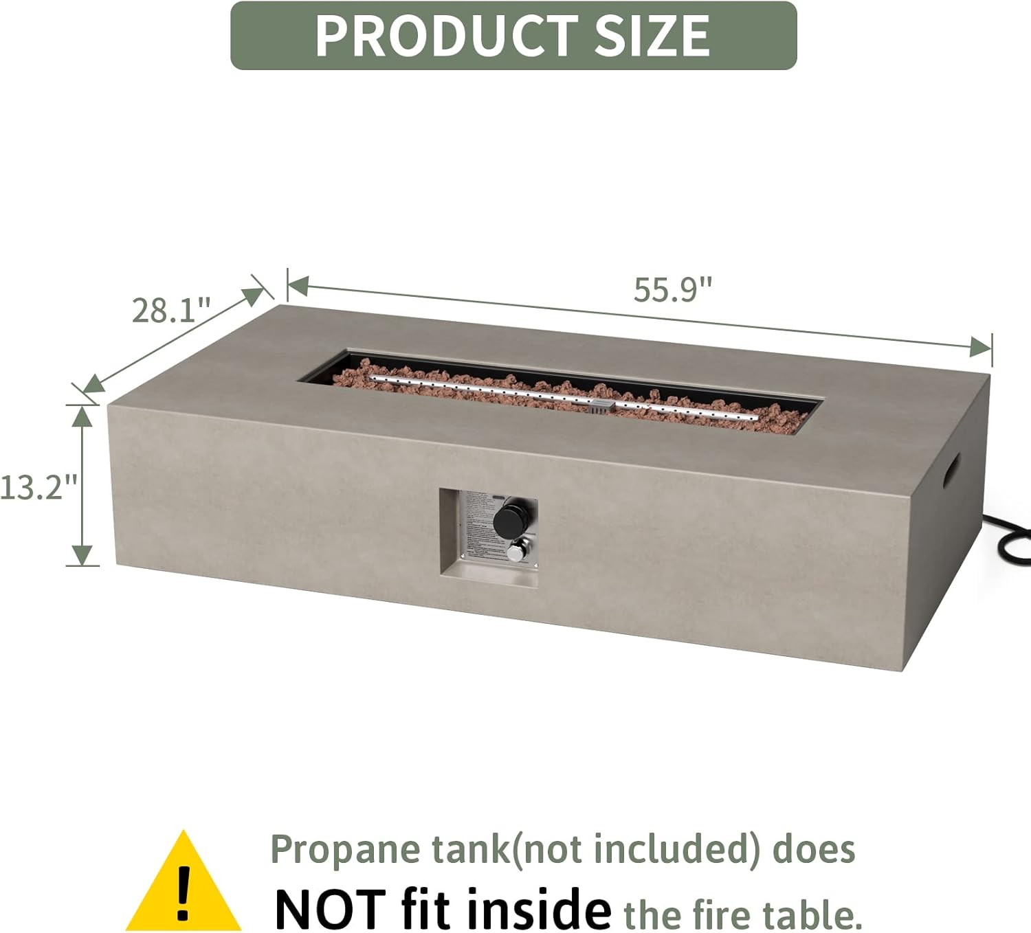 - 🔥 【 GATHER ROUND THE FIRE 】: The rectangular cubic table base cannot conceal an ordinary 20-gallon propane tank ( tank not included) and features the classic stacked concrete-like mantle appearance. The tabletop and metal cover extends further providing a perfect place for cocktails and appetizers. All built to last from sturdy, fire retardant magnesium oxide with a stainless steel burner bowl. Lights with the push of a button and flame intensity is controlled by the turn of a knob.