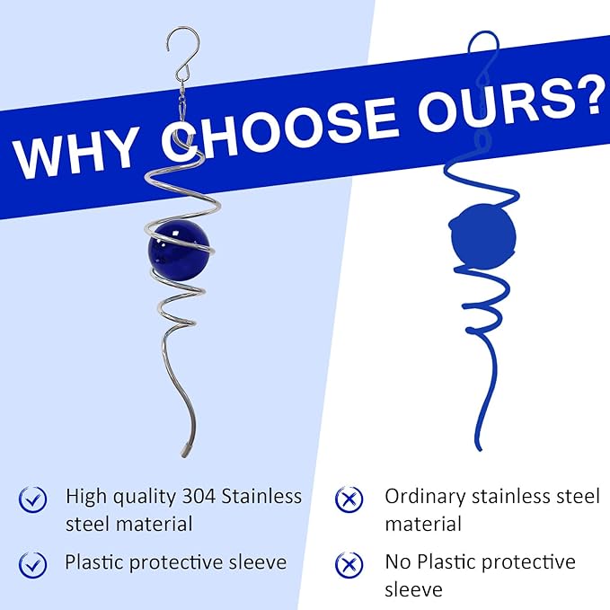 - ✔【Easy to use】The spiral tail wind spinner can't spin by itself ,if you want to make it spin like the video ,need add 1pc motor (not include) ,or combine it with a wind spinner or any rotatable hanging ornament to help it rotate. Come with 1pc 2 inch dark blue glass orb(not paint),1pc silver color spiral tail twister,and 1pc swivel hook accessory, ready to hang and enjoy.
