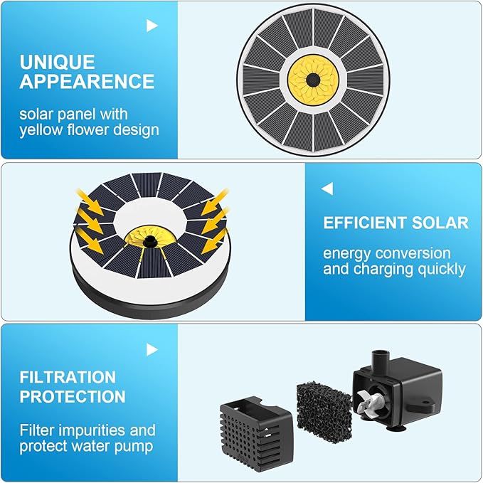 - Elegant Design:This solar powered fountain pump is both functional and stylish;Its yellow centerpiece design resembles a blooming flower,adding a touch of beauty to any garden or outdoor space