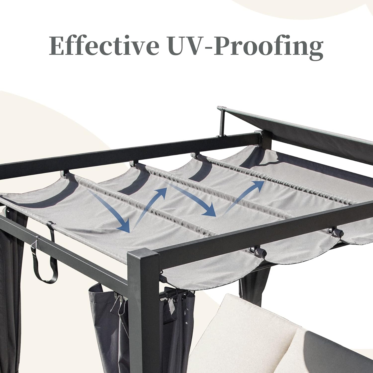 Domi Aluminum Outdoor Patio Daybed with Retractable Canopy Bed, Double Chaise Lounge Outdoor Grey Curtain with Beige Cushion & Cup Holder, for Outside Pool,Garden,Backyard,Lawn
