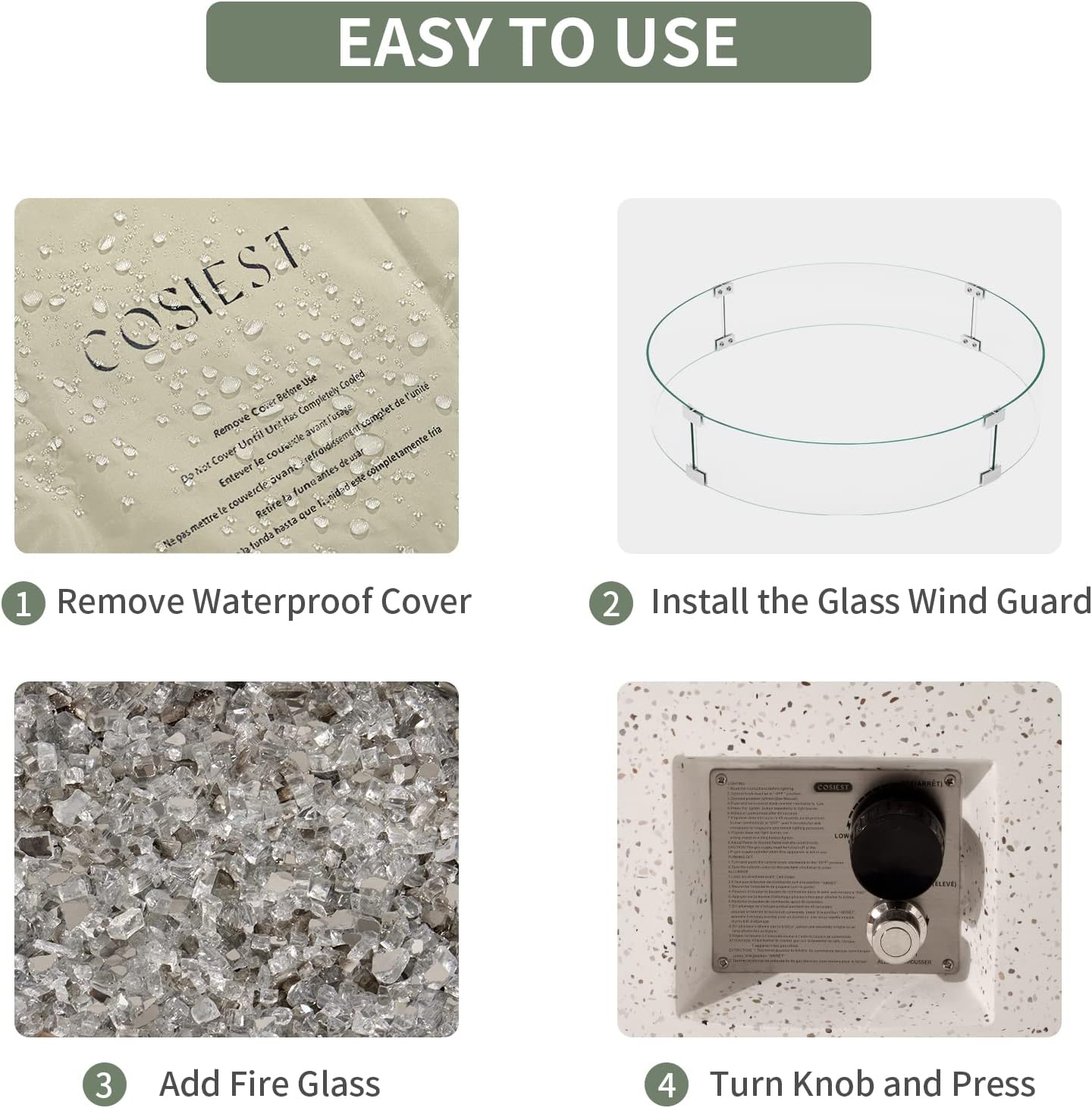 COSIEST Outdoor Propane Fire Pit Coffee Table w Terrazzo White 42 inch Round Base Patio Heater, CSA Certified, 50,000 BTU Stainless Steel Burner, Wind Guard, Transparent Gray Fire Glass, Rain Cover