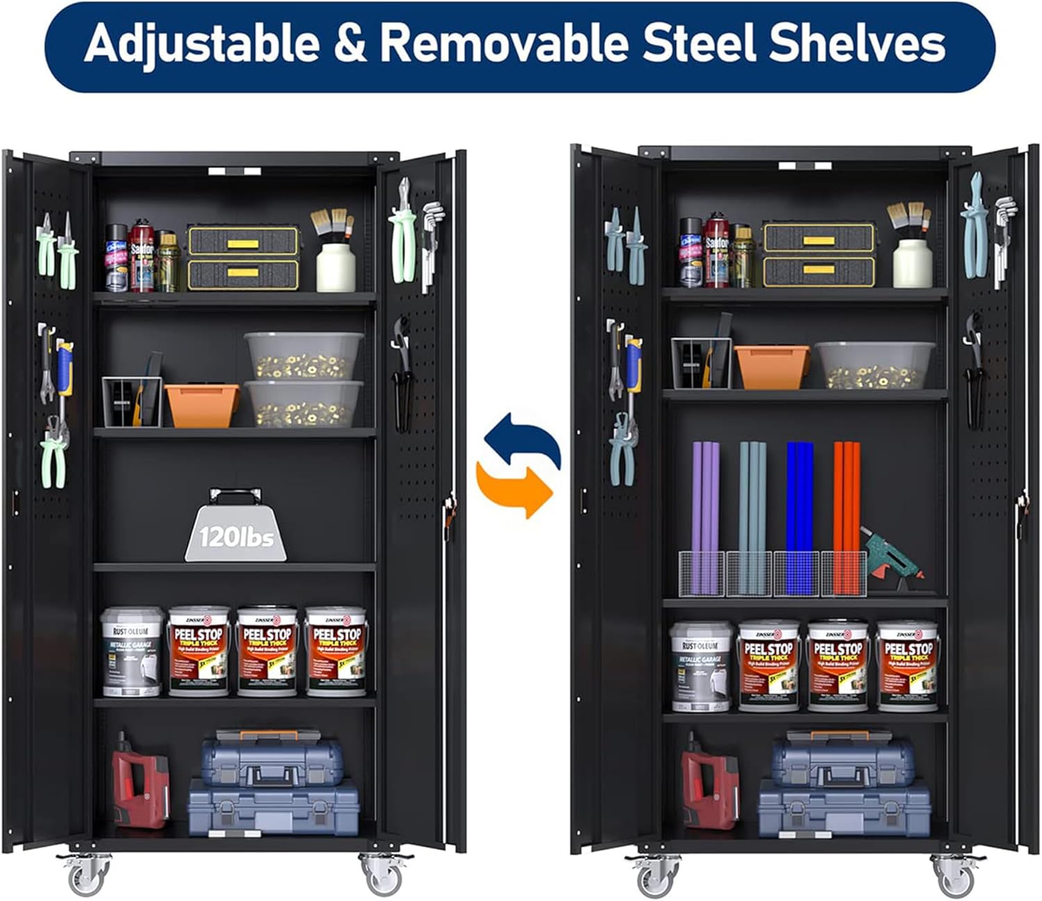 - γUtility Pegboard & Adjustable Shelves γRedesign your organizing ways, hang up everything on the door, get effortless accessible for a variety of small hardware, no more searching for things among the clutter. Tall Garage storage cabinet with wheels is designed with 4 adjustable shelves, you can easily meet your different storage needs by adjusting the height between the shelves.