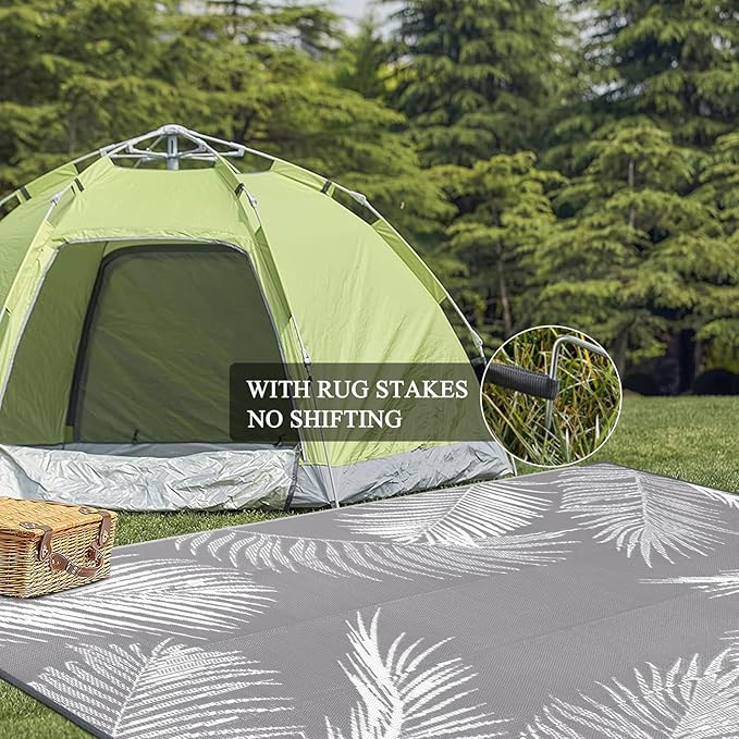 - Lightweight & Portable: This outside camping rug comes with a carrying bag for easy storage and transport. Rug stakes allow secure placement, indoor outdoor rugs perfect for camping, beach trip, barbecue picnic or RV road trip