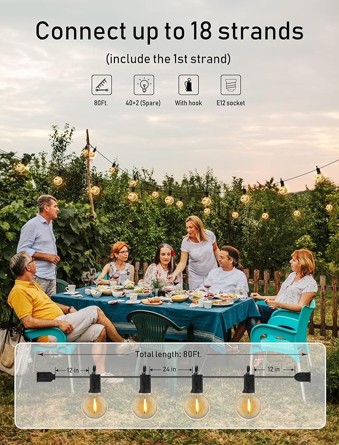 - 【 80ft LED String Lights 】- This outdoor light comes with 40 clear G40 LED bulbs. Each bulb is 2 feet apart for a total length of 80 feet. It supports an end-to-end connection of up to 17 strings, allowing you to customize the length you need. With the size of 1*1*2 ft, these lightweight and convenient patio lights are easy to carry and store