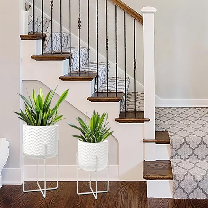 TRIROCKS Set of 2 Planters with Stand Indoor Outdoor Metal Plant Stand 18 &12" Tall Modern Planters Flower Pots for Living Room Corner Kitchen Office Garden Balcony Patio Decor(White)