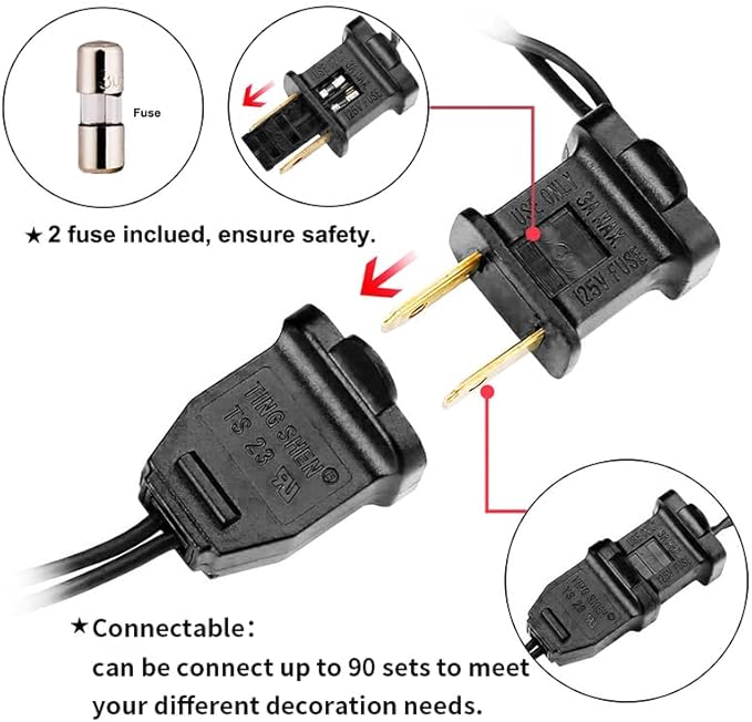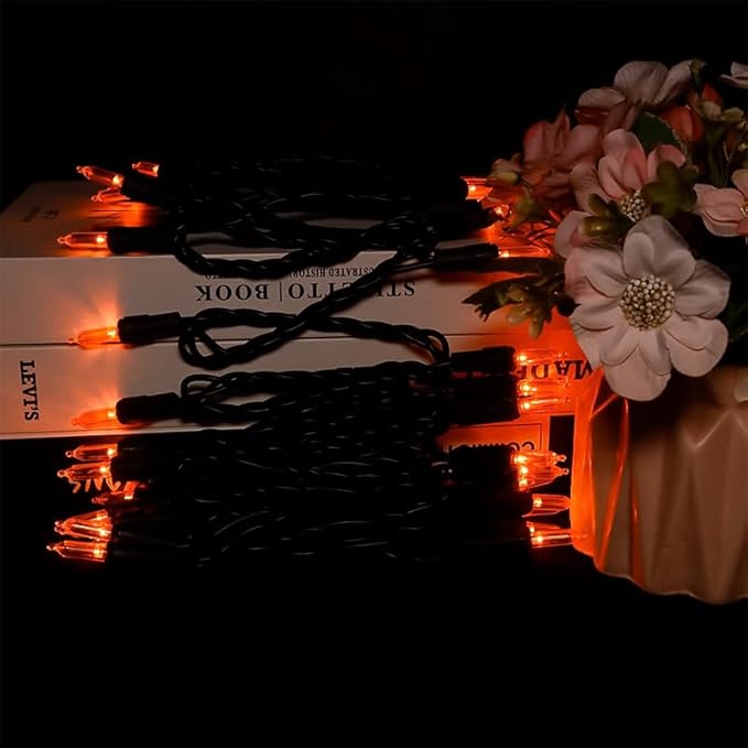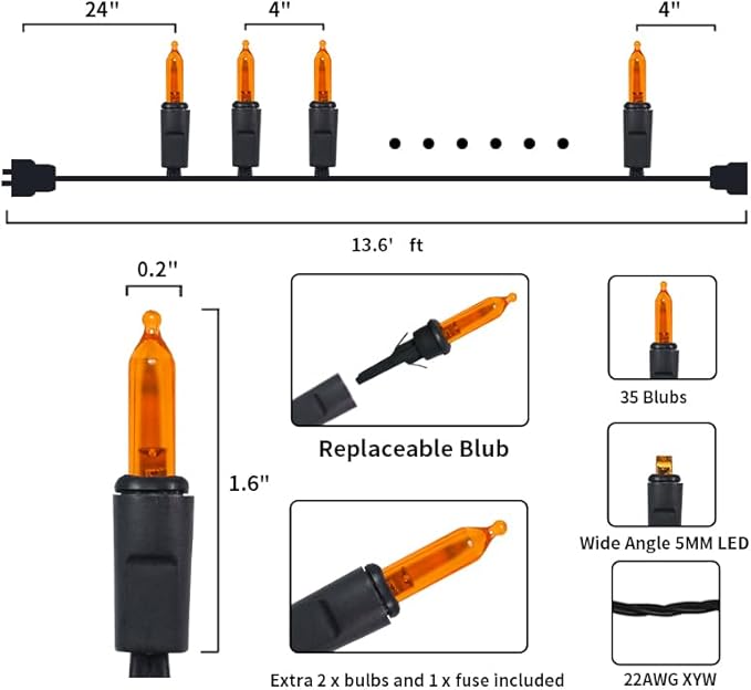 - 【Mini Halloween Lights Specification】: 1 Sets - black wire halloween light strings includes 35 count orange led lights, total length 13.6ft, lights length 11ft and each led is 4 inches apart, 24 inches lead wire, 4 inches end connector (Extra 2 x bulbs and 1 x fuse included)