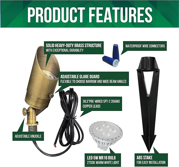 - ✔Easy Installation:Equipped with ABS ground spike, wire connectors (1 #14 w/1-3 #18 or 20, 2 #14 w/1 #18), MR16 bulb and 39.9’’ pre-wired leads, these lights can be easily installed. Compatible with most 12V landscape lighting systems. Must be powered by a 12V low voltage transformer (not included).