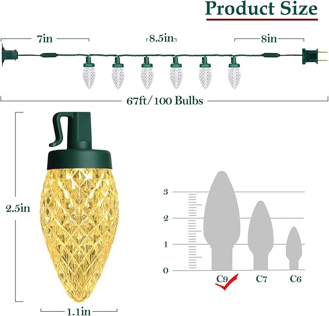 - šćShatterproof C9 Strawberry LED Bulbsć Each strand of string lights is 67 feet long and equipped with 100 bright C9 strawberry-shaped LED bulbs. They are easy to use - just plug and unplug for ON and OFF - and long enough to wrap around a Christmas tree or anywhere else you'd like to add some light, such as your porch, garden, lawn, yard, or roof.