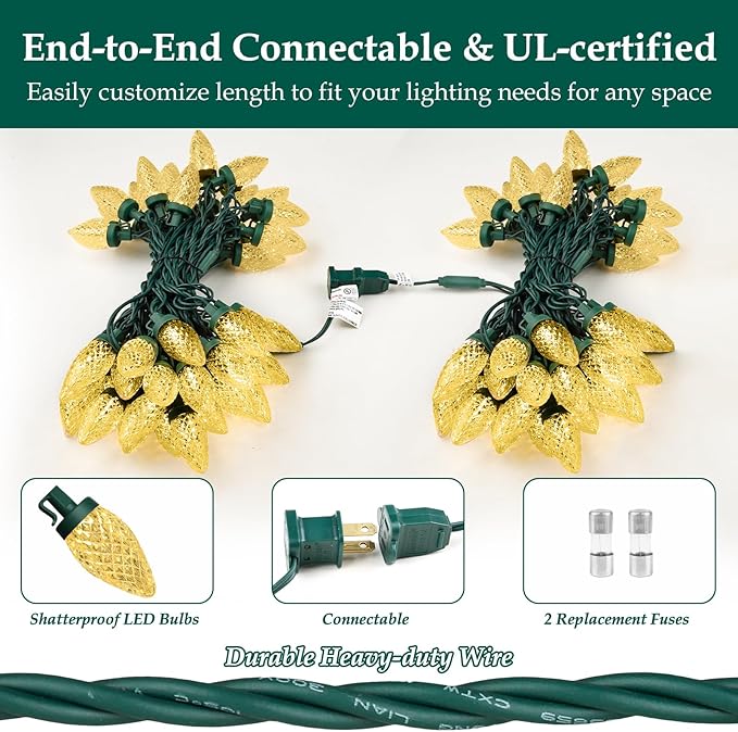 - šćSuitable for All SeasonsćDon't worry about weather conditions. Our LED outdoor Christmas lights are constructed with high-quality materials and designed to withstand rain, snow or heat. They are waterproof, making them perfect for year-round use, whether it's for a party, holiday, wedding, or simply adding decorative lighting to your indoor or outdoor space.