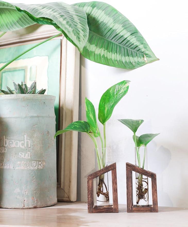 - Plant propagatin:Set stylishly in wooden holder, plant rooting vases bring your plants a beautiful designed display with test tube. Perfect for plant cuttings, like pothos, miniature ferns or new marimo moss ballwould do nicely. Needs will vary with different species and families, and where you choose to display them! Appreciating it everyday would reward you a pleasant mood.