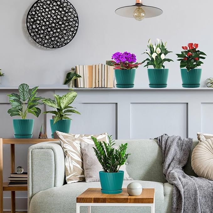 7 Inch Plant Pots Bulk, 6 Pack Plastic Planters with Drainage Holes and Saucers for Indoor Outdoor House Plants and Flowers, Green