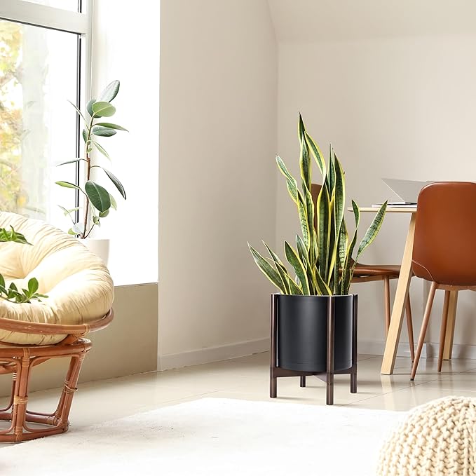 • A Complete Set: Minimalist plastic planter, combined with a sculptural, solid wood stand that match perfectly together and looks great in any home.