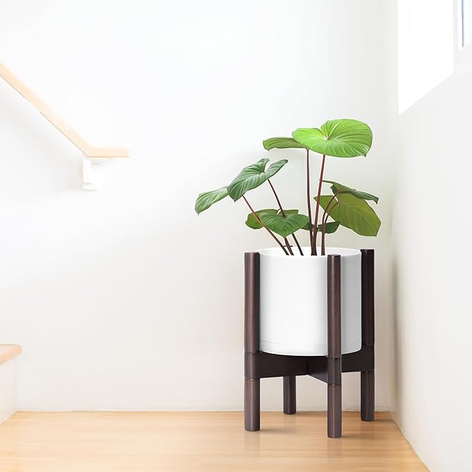 • A Complete Set: Minimalist plastic planter, combined with a sculptural, solid wood stand that match perfectly together and looks great in any home.