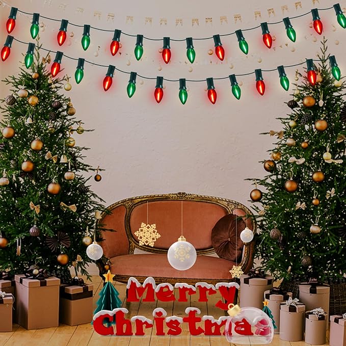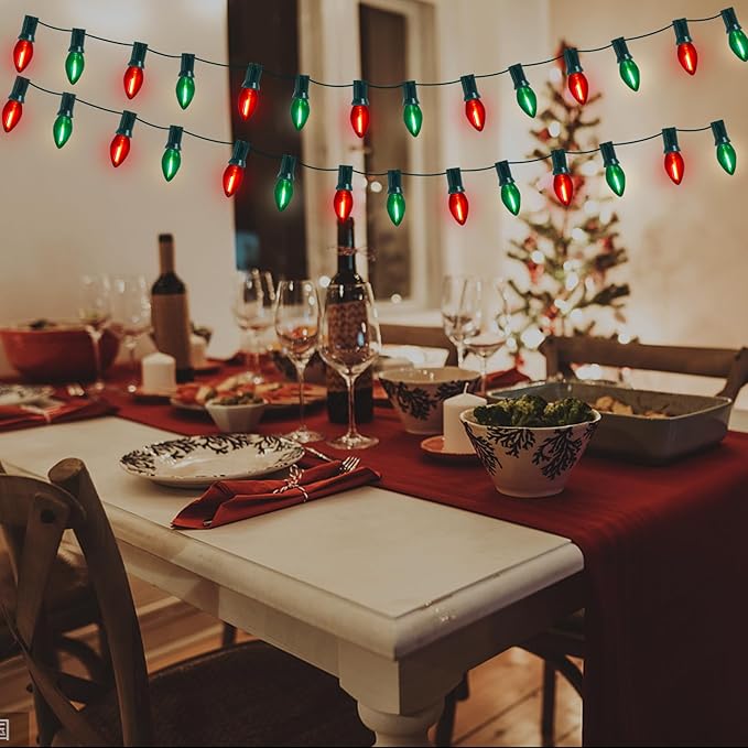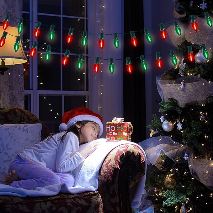 - ๐ Versatile Application: Red green christmas decorations lights glow a warm white lights, retro Christmas light string is dimmable, lights dimming requires a dimmer. c7 led christmas lights can be used both indoor and outdoor, such as the bedroom, bar, window, Christmas tree, party, wedding, window, holidays, festivals, shows, restaurants, hotels, shopping centers, patio, or porch, pathway, roofline decorations and lightings